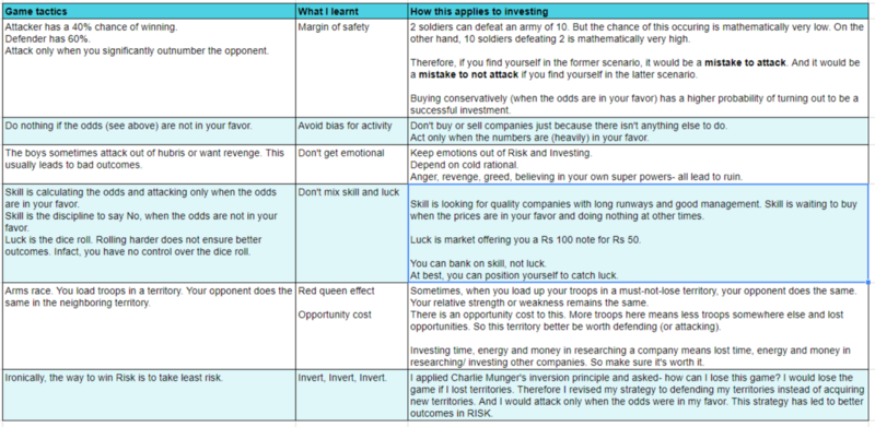 Since we started playing this game, 8 months ago, I observed a few things such as -winning a difficult territory gives you a huge adrenaline rush. Losing a territory, leads to revenge-attacks because of deprival-super reaction tendencies. And, on the whole, we tended to rely on emotions and not probability theory, when deciding what to do. In short, I saw a lot of similarities between Risk and Investing. And I figured that what works in investing can work in Risk as well.