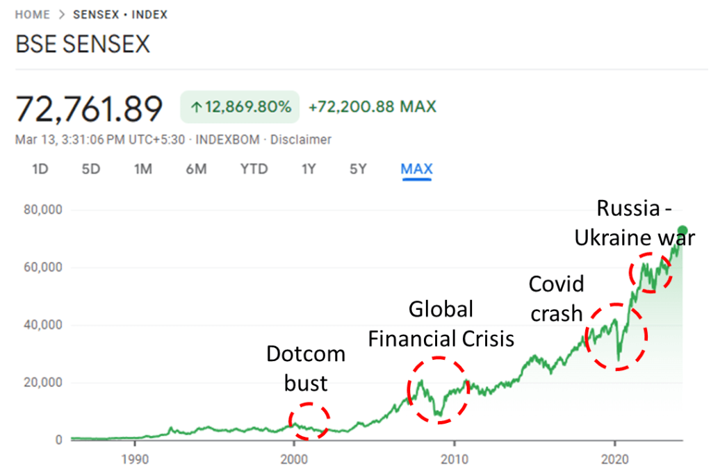 My journalist friends won’t like it, but the fact is that if you paid too much attention to news, you would end up with a feeling of the world coming to an end anytime now. For example, this is what the Sensex did today (13-Mar-2024).