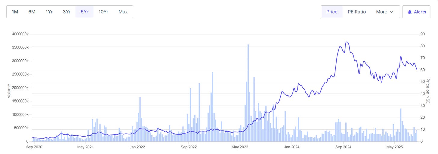 As a result of some good business decisions and some luck (regulations changing, massive investments in wind energy, a competitor exiting India etc.), the stock went up about 8X, from Rs 7.50 per share to Rs 60 today.