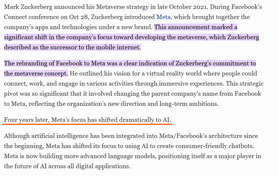 Do you remember the Metaverse? It was supposed to be a virtual universe where we would interact, share etc in the virtual world. Facebook created a holding company and called it Meta. It went all-in into this idea.